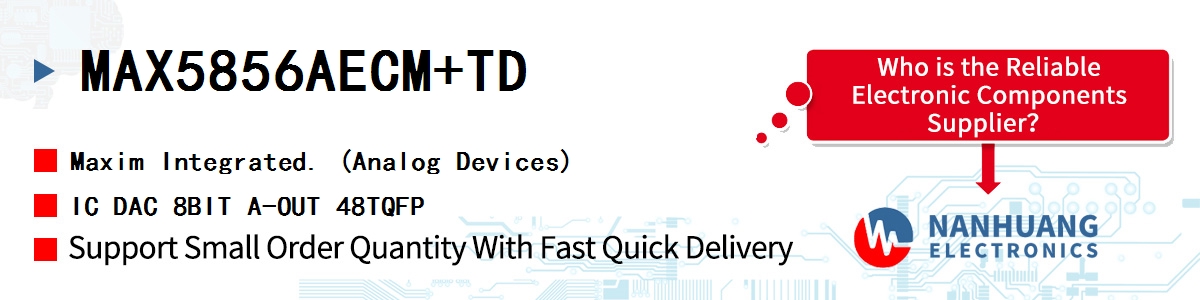 - MAX5856AECM+TD Maxim Integrated, IC DAC 8BIT A-OUT 48TQFP, Integrated Circuits (ICs)~Data Acquisition - Digital to Analog Converters (DAC)
