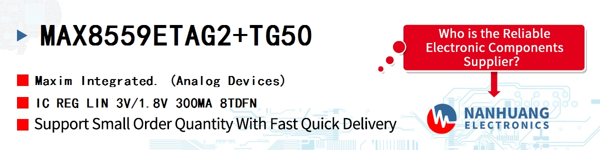 - MAX8559ETAG2+TG50 Maxim Integrated, IC REG LIN 3V/1.8V 300MA 8TDFN, Integrated Circuits (ICs)~PMIC - Voltage Regulators - Linear