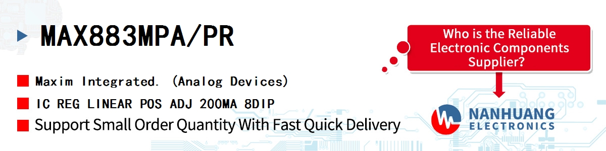 - MAX883MPA/PR+ Maxim Integrated, IC REG LINEAR POS ADJ 200MA 8DIP, Integrated Circuits (ICs)~PMIC - Voltage Regulators - Linear