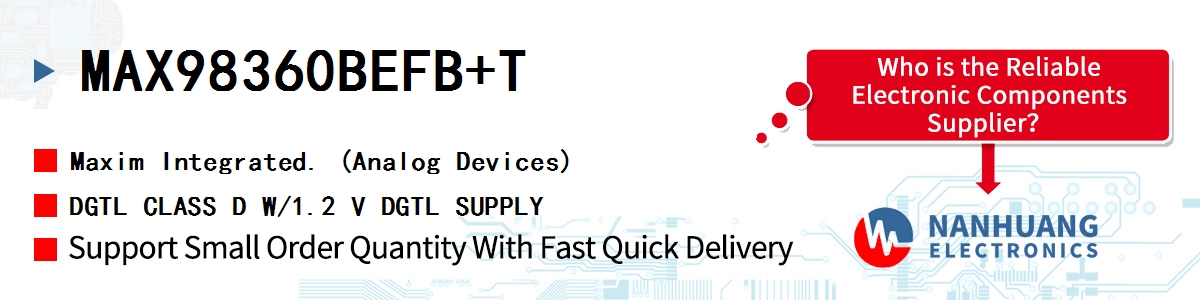 MAX98360BEFB+T, Maxim authentic parts in stock from Maxim Integrated authorized distributors, order today, can ship immediately.