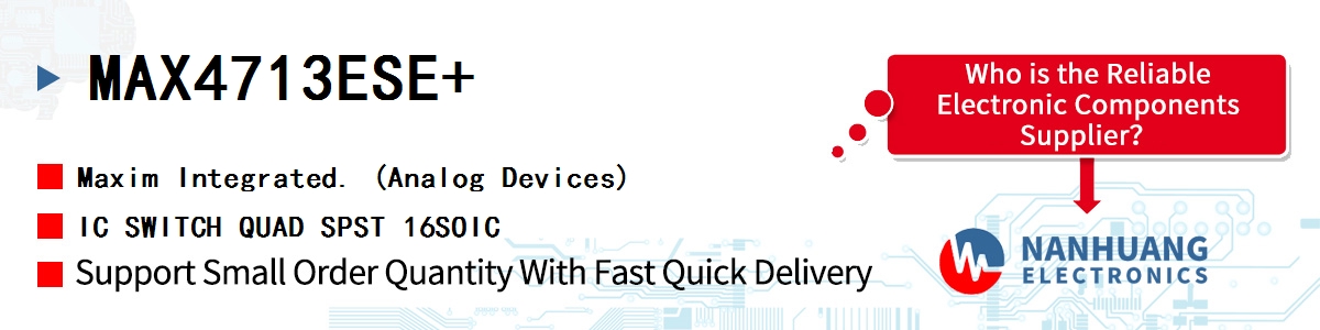 - MAX4713ESE Maxim Integrated, IC SWITCH QUAD SPST 16SOIC, Integrated Circuits (ICs)~Interface - Analog Switches, Multiplexers, Demultiplexers