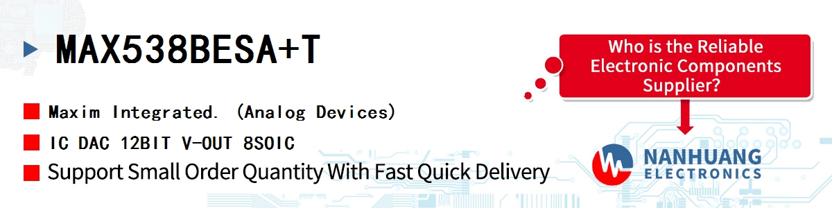 - MAX538BESA+T Maxim Integrated, IC DAC 12BIT V-OUT 8SOIC, Integrated Circuits (ICs)~Data Acquisition - Digital to Analog Converters (DAC)